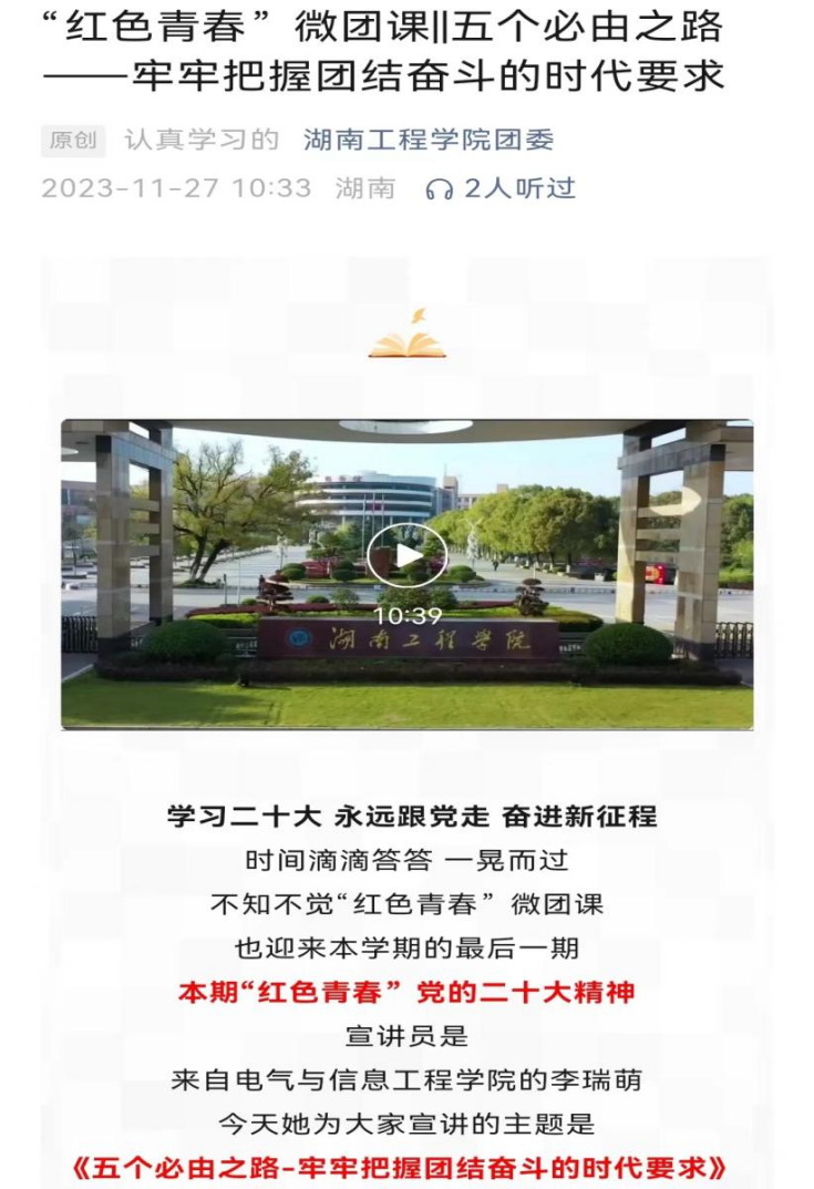 青年在哪里,宣讲团就在哪里,青年喜欢什么形式,宣讲团就创新什么形式。该校“红色青春”宣讲团积极探索推出云直播、云课堂等,将“定点定时”的传统宣讲延展为“随时随地”的网络云课堂,实现宣讲全天候、不断线。宣讲团积极打造“明星”宣讲团,制作宣讲“云”菜单,运用点单式供基层团组织根据需求自行提交宣讲需求,同时充分利用团属双微平台,开设专题学习页面,广泛报道宣讲员培训情况以及宣讲会开展情况,并已投放了《五个必由之路——牢牢把握团结奋斗的时代要求》《中国式现代化——推进中华民族伟大复兴的使命任务和基本路径》等7期“微”团课视频,打造“指尖”云宣讲,点赞量、播放量、转发量可观。青春的宣讲力量从线下到线上,推动习近平新时代中国特色社会主义思想引领、影响、教育着更多青年学生奋发向上。