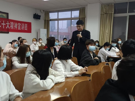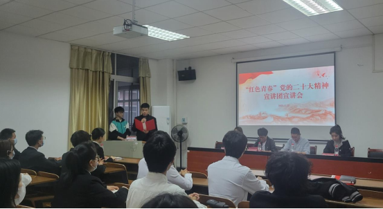 为深入学习贯彻党的二十大精神,准确把握核心要义和实践要求,用党的科学理论武装青年,用党的初心使命感召青年,坚定青年内心选择,增强青年理想信念和担当意识,5月11日晚,伟德“红色青春宣讲团”到管理学院开展专题宣讲。本次宣讲由校团委主办,管理学院团总支承办。校团委、管理学院相关负责人,管理学院教师代表及40余名优秀团员青年代表参加宣讲会。